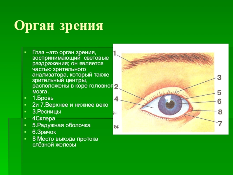 Глаз –это орган зрения, воспринимающий световые раздражения; он является частью