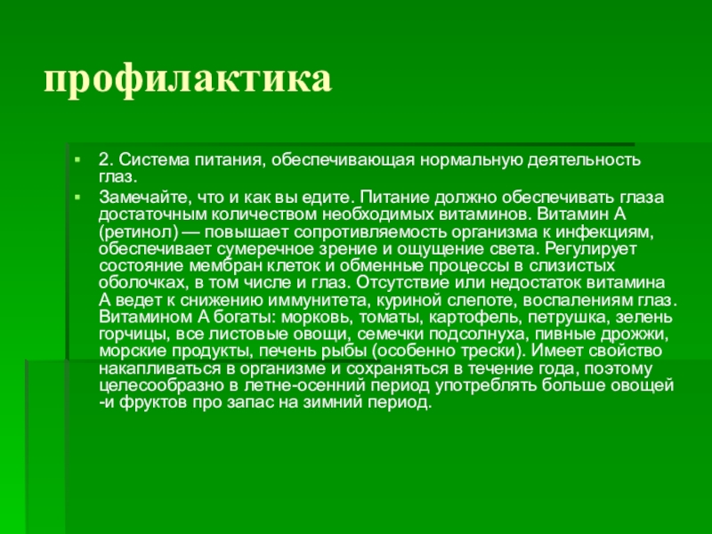 едите. Питание должно обеспечивать глаза достаточным количеством необходимых витаминов. Витамин А (ретинол) — повышает сопротивляемость организма к инфекциям, обеспечивает сумеречное зрение и ощущение света. Регулирует состояние мембран клеток и обменные процессы в слизистых оболочках, в том числе и глаз. Отсутствие или недостаток витамина А ведет к снижению иммунитета, куриной слепоте, воспалениям глаз. Витамином А богаты: морковь, томаты, картофель, петрушка, зелень горчицы, все листовые овощи, семечки подсолнуха, пивные дрожжи, морские продукты, печень рыбы (особенно трески). Имеет свойство накапливаться в организме и сохраняться в течение года, поэтому целесообразно в летне-осенний период употреблять больше овощей -и фруктов про запас на зимний период.