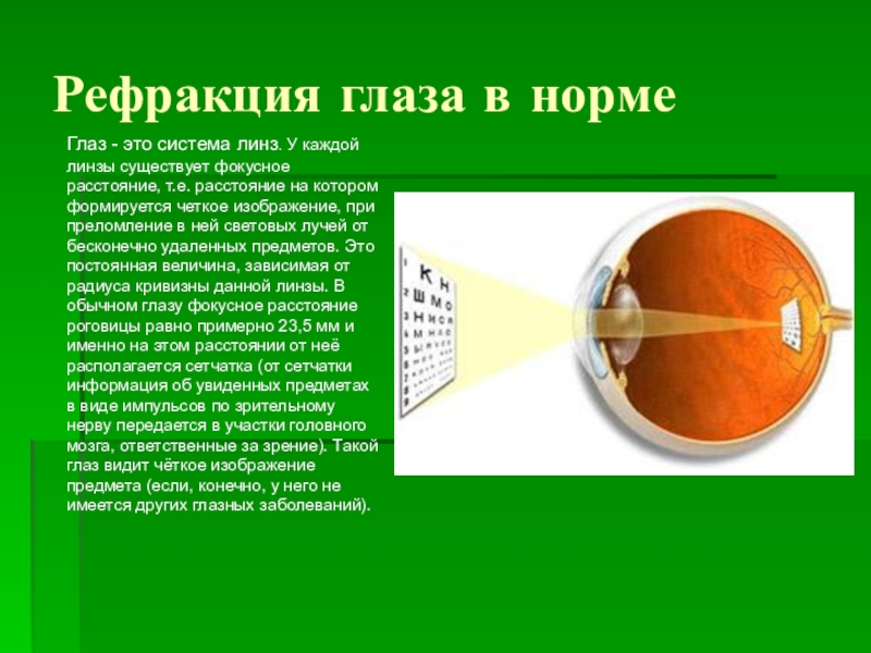 существует фокусное расстояние, т.е. расстояние на котором формируется четкое изображение, при преломление в ней световых лучей от бесконечно удаленных предметов. Это постоянная величина, зависимая от радиуса кривизны данной линзы. В обычном глазу фокусное расстояние роговицы равно примерно 23,5 мм и именно на этом расстоянии от неё располагается сетчатка (от сетчатки информация об увиденных предметах в виде импульсов по зрительному нерву передается в участки головного мозга, ответственные за зрение). Такой глаз видит чёткое изображение предмета (если, конечно, у него не имеется других глазных заболеваний).