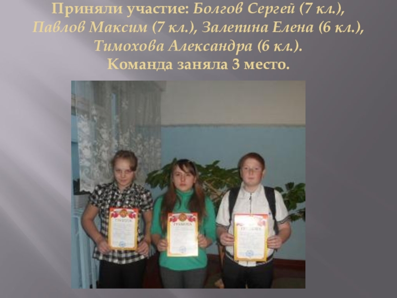 Слайд 5Приняли участие: Болгов Сергей (7 кл.), Павлов Максим (7 кл.), Залепина Елена