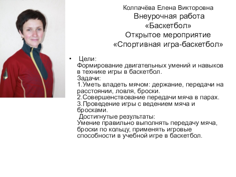 Слайд 15Колпачёва Елена Викторовна Внеурочная работа «Баскетбол» Открытое мероприятие «Спортивная игра-баскетбол»
