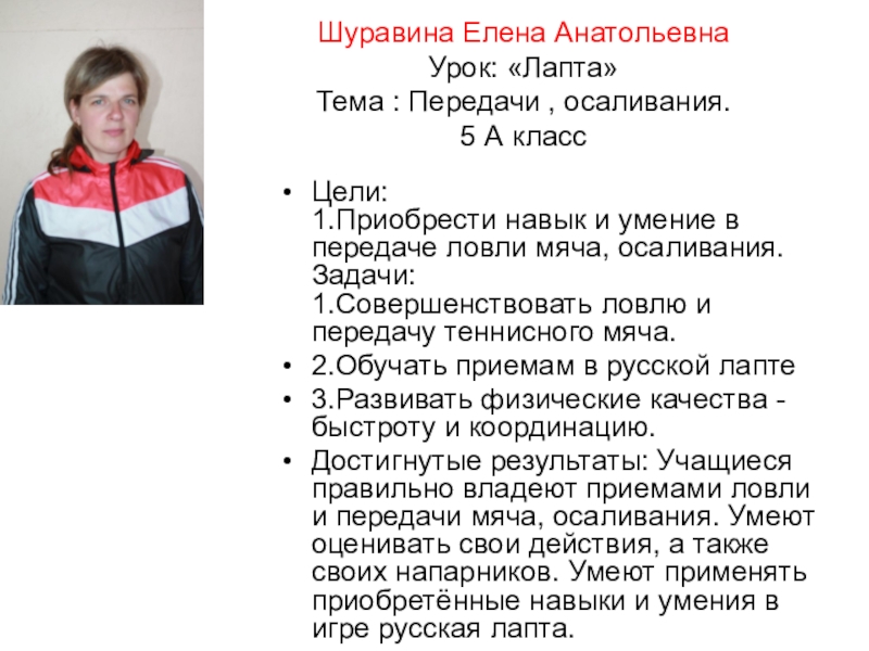 Слайд 2Шуравина Елена Анатольевна Урок: «Лапта» Тема : Передачи , осаливания. 5 А класс