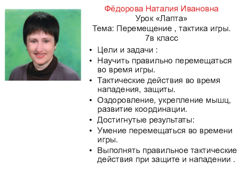Слайд 5Фёдорова Наталия Ивановна Урок «Лапта» Тема: Перемещение , тактика игры. 7в класс
