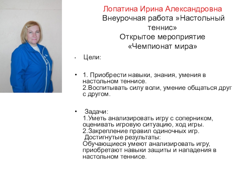 Слайд 10Лопатина Ирина Александровна Внеурочная работа »Настольный теннис» Открытое мероприятие «Чемпионат мира»