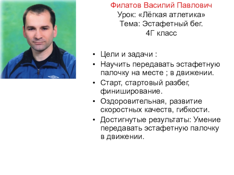 Слайд 6Филатов Василий Павлович Урок: «Лёгкая атлетика» Тема: Эстафетный бег. 4Г класс
