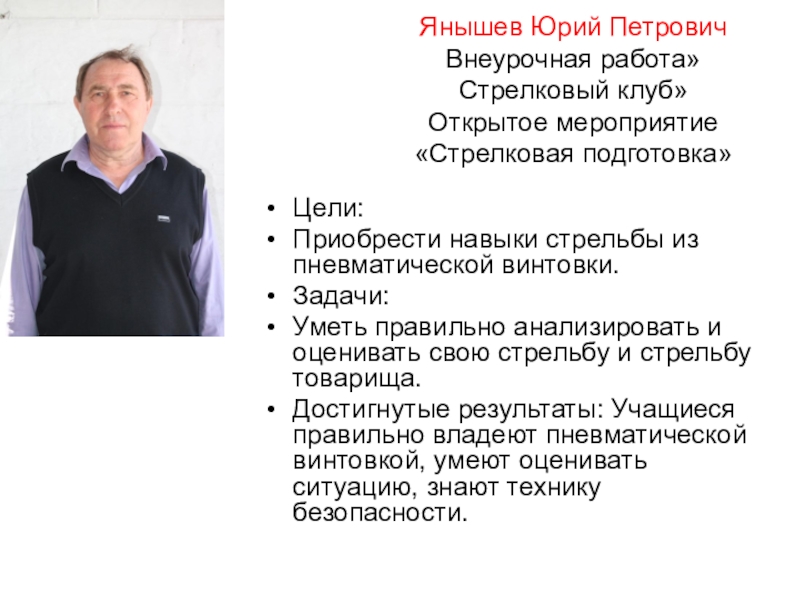 Слайд 7Янышев Юрий Петрович Внеурочная работа»Стрелковый клуб» Открытое мероприятие «Стрелковая подготовка»
