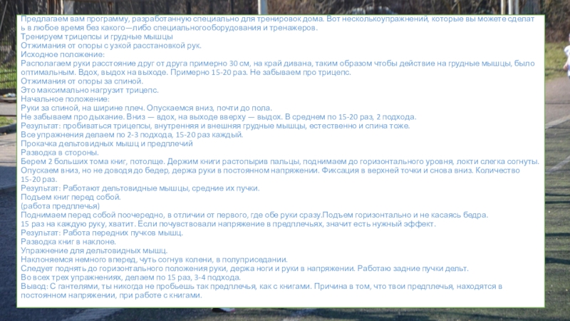 Слайд 6Предлагаем вам программу, разработанную специально для тренировок дома. Вот несколькоупражнений, которые вы можете сделать в любое время без какого—либо специальногооборудования и тренажеров.
