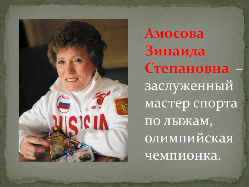 Слайд 19Амосова Зинаида Степановна – заслуженный мастер спорта по лыжам, олимпийская чемпионка.