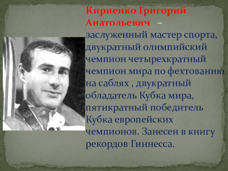 Слайд 10Кириенко Григорий Анатольевич – заслуженный мастер спорта, двукратный олимпийский чемпион