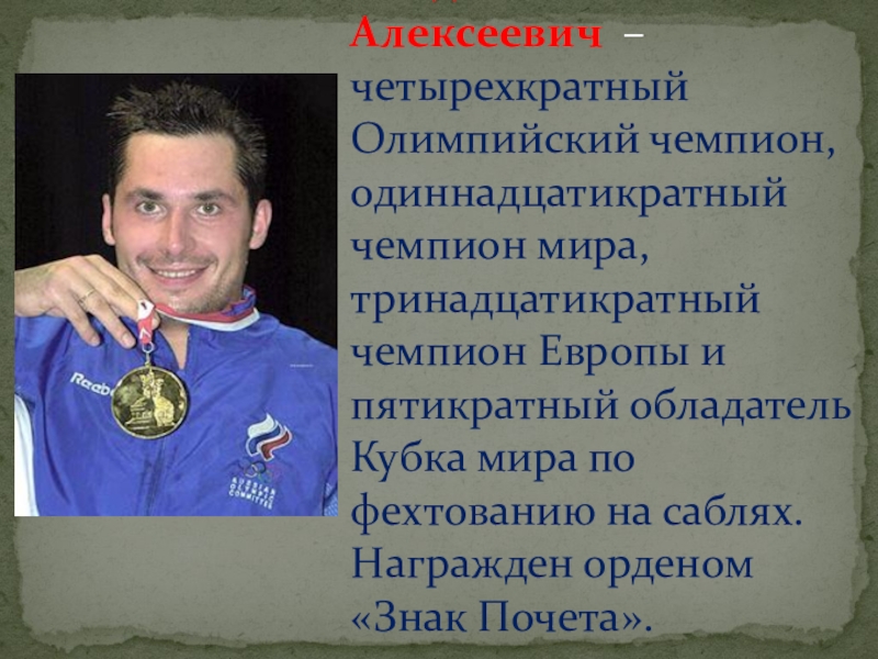 Слайд 8Поздняков Станислав Алексеевич – четырехкратный Олимпийский чемпион, одиннадцатикратный чемпион мира, тринадцатикратный
