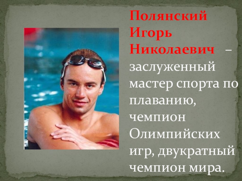 Слайд 14Полянский Игорь Николаевич – заслуженный мастер спорта по плаванию, чемпион