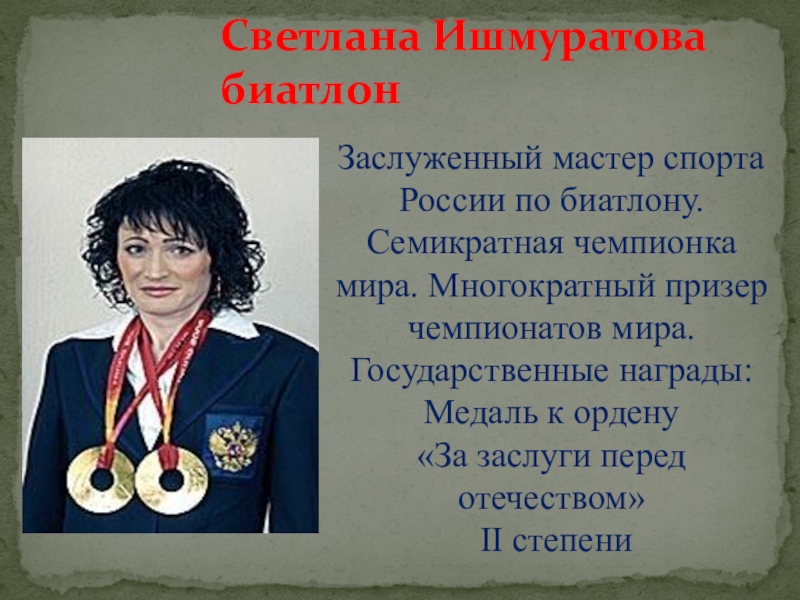 Заслуженный мастер спорта России по биатлону. Семикратная чемпионка мира. Многократный