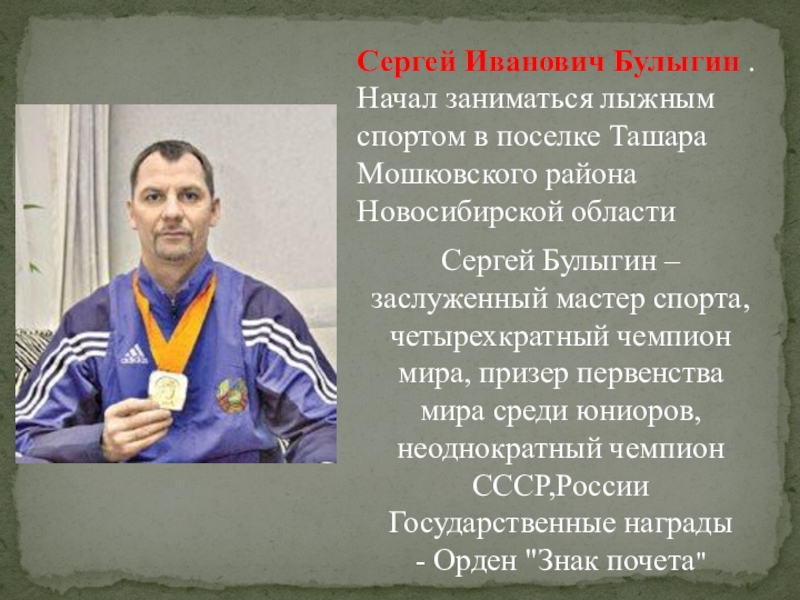 Слайд 18Сергей Иванович Булыгин . Начал заниматься лыжным спортом в поселке Ташара