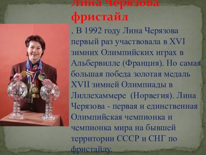 ХVI зимних Олимпийских играх в Альбервилле (Франция). Но самая большая победа золотая медаль ХVII зимней Олимпиады в Лиллехаммере (Норвегия). Лина Черязова - первая и единственная Олимпийская чемпионка и чемпионка мира на бывшей территории СССР и СНГ по фристайлу.