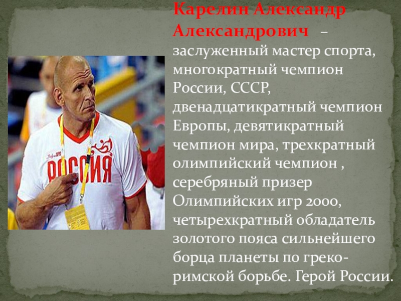 Слайд 9Карелин Александр Александрович – заслуженный мастер спорта, многократный чемпион России,