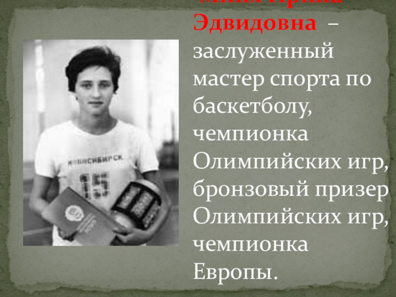 Слайд 15 Минх Ирина Эдвидовна – заслуженный мастер спорта по баскетболу, чемпионка