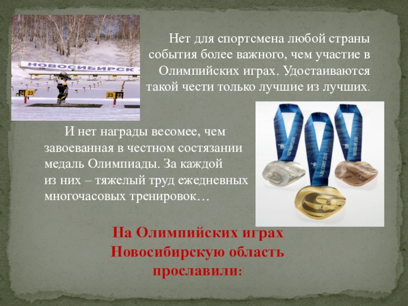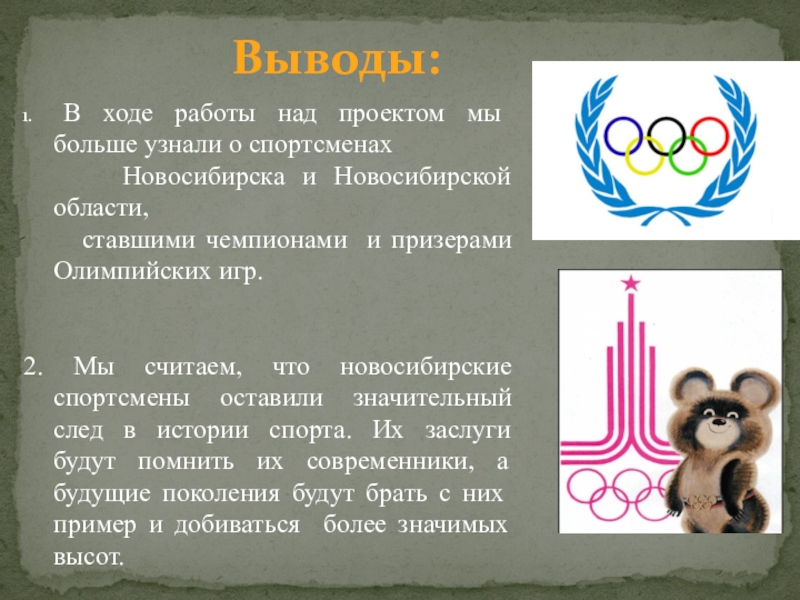 2. Мы считаем, что новосибирские спортсмены оставили значительный след в истории спорта. Их заслуги будут помнить их современники, а будущие поколения будут брать с них пример и добиваться более значимых высот.