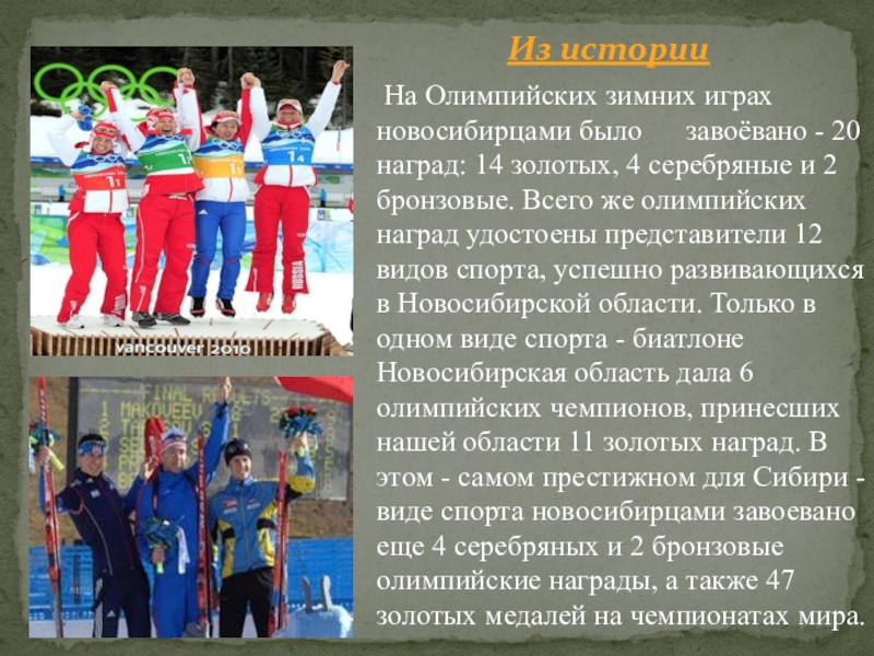20 наград: 14 золотых, 4 серебряные и 2 бронзовые. Всего же олимпийских наград удостоены представители 12 видов спорта, успешно развивающихся в Новосибирской области. Только в одном виде спорта - биатлоне Новосибирская область дала 6 олимпийских чемпионов, принесших нашей области 11 золотых наград. В этом - самом престижном для Сибири - виде спорта новосибирцами завоевано еще 4 серебряных и 2 бронзовые олимпийские награды, а также 47 золотых медалей на чемпионатах мира.