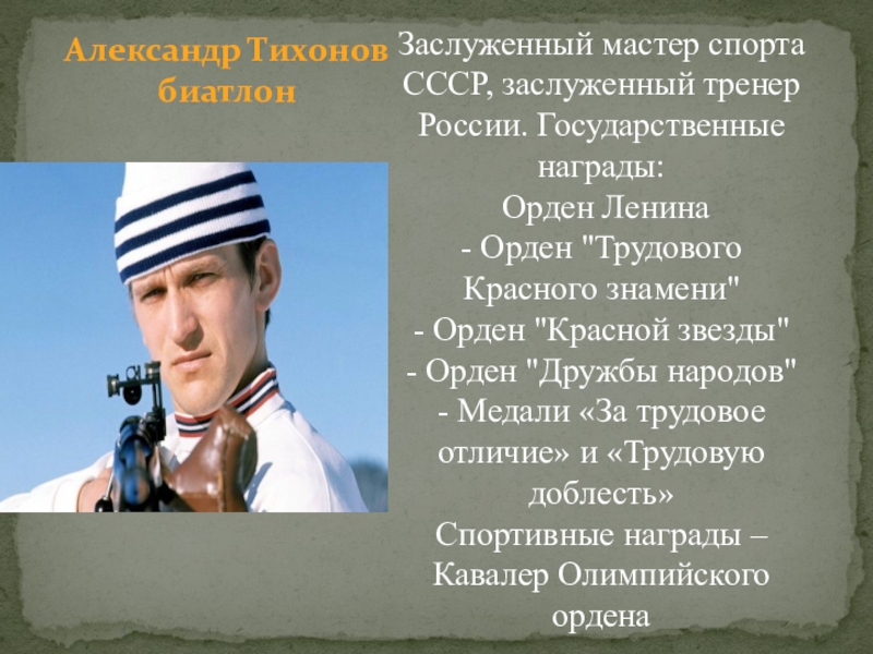 Слайд 6Тихонов Александр Иванович – заслуженный мастер спорта по биатлону, четырехкратный олимпийский