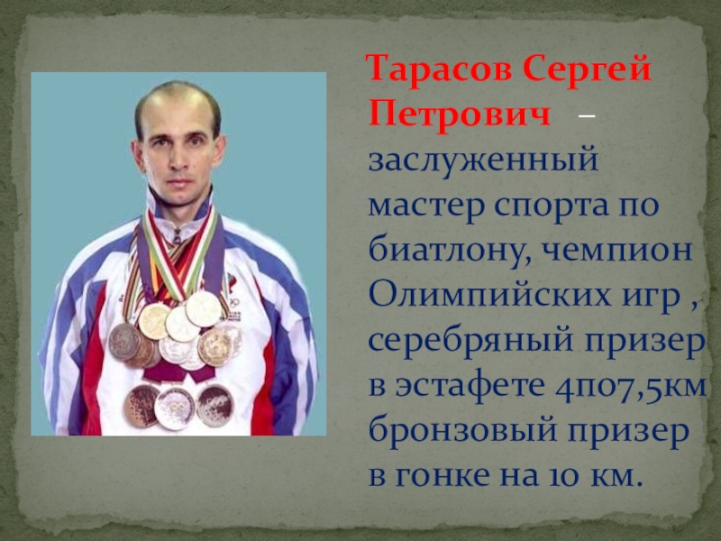 Слайд 16Тарасов Сергей Петрович – заслуженный мастер спорта по биатлону, чемпион