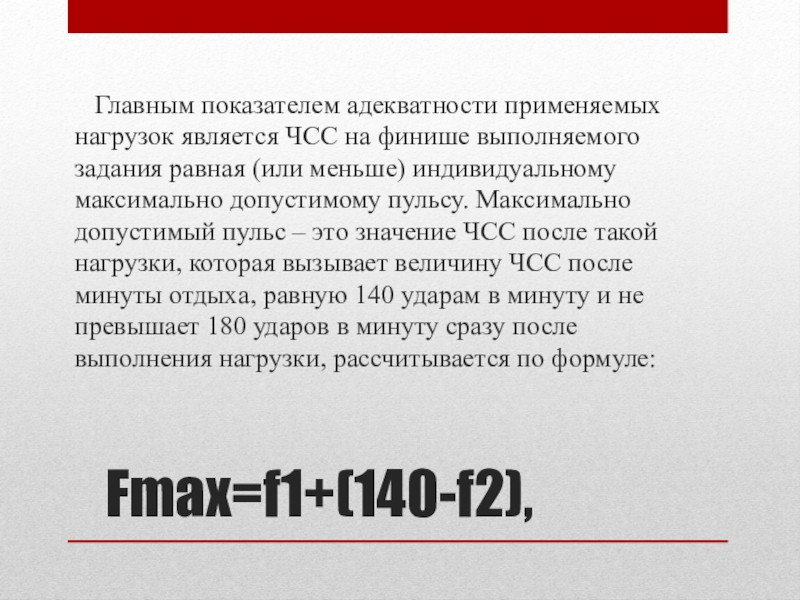 выполняемого задания равная (или меньше) индивидуальному максимально допустимому пульсу. Максимально допустимый пульс – это значение ЧСС после такой нагрузки, которая вызывает величину ЧСС после минуты отдыха, равную 140 ударам в минуту и не превышает 180 ударов в минуту сразу после выполнения нагрузки, рассчитывается по формуле: