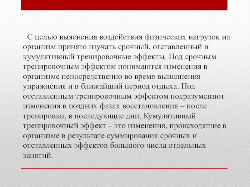 срочный, отставленный и кумулятивный тренировочные эффекты. Под срочным тренировочным эффектом понимаются изменения в организме непосредственно во время выполнения упражнения и в ближайший период отдыха. Под отставленным тренировочным эффектом подразумевают изменения в поздних фазах восстановления – после тренировки, в последующие дни. Кумулятивный тренировочный эффект – это изменения, происходящие в организме в результате суммирования срочных и отставленных эффектов большого числа отдельных занятий.