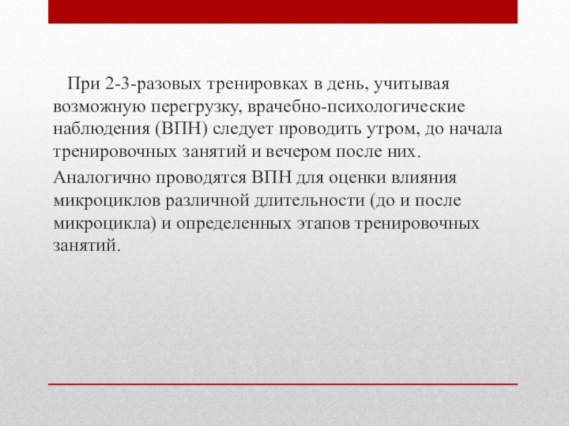 Слайд 17 При 2-3-разовых тренировках в день, учитывая возможную перегрузку, врачебно-психологические