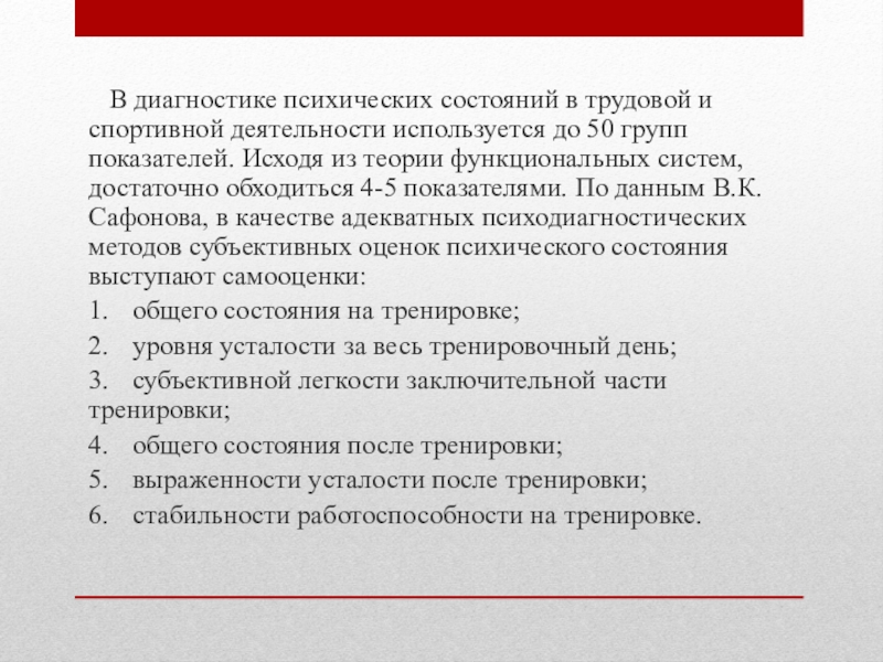 используется до 50 групп показателей. Исходя из теории функциональных систем, достаточно обходиться 4-5 показателями. По данным В.К. Сафонова, в качестве адекватных психодиагностических методов субъективных оценок психического состояния выступают самооценки: