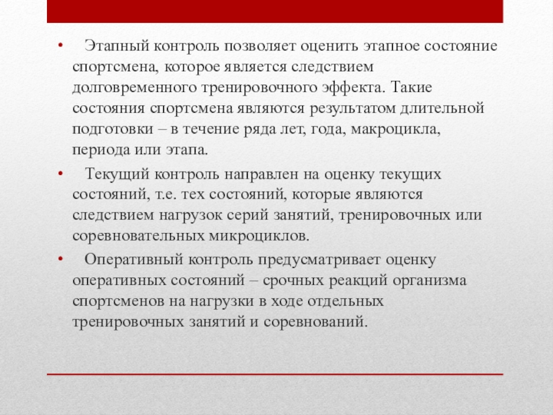 Слайд 7 Этапный контроль позволяет оценить этапное состояние спортсмена, которое является