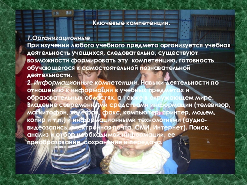 2. Информационные компетенции. Навыки деятельности по отношению к информации в учебных предметах и образовательных областях, а также в окружающем мире. Владение современными средствами информации (телевизор, магнитофон, телефон, факс, компьютер, принтер, модем, копир и т.п.) и информационными технологиями (аудио- видеозапись, электронная почта, СМИ, Интернет). Поиск, анализ и отбор необходимой информации, ее преобразование, сохранение и передача.