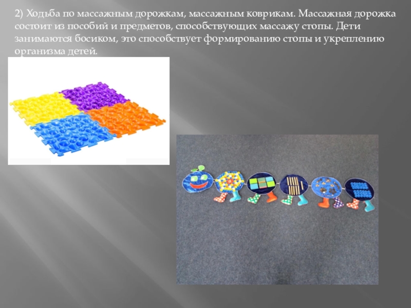 Слайд 132) Ходьба по массажным дорожкам, массажным коврикам. Массажная дорожка состоит из