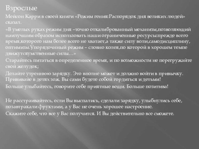 умелых руках режим дня –точно откалиброванный механизм,позволяющий наилучшим образом использовать наши ограниченные ресурсы:прежде всего время,которого нам более всего не хватает,а также силу воли,самодисциплину,оптимизм.Упорядочнный режим – словно колея,по которой в хорошем темпе движутсяумственные силы…»