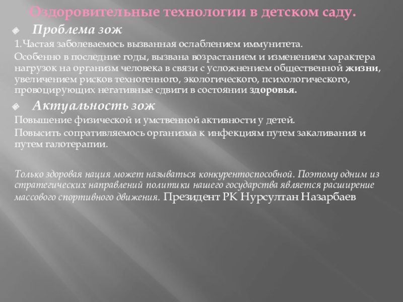 Только здоровая нация может называться конкурентоспособной. Поэтому одним из стратегических направлений политики нашего государства является расширение массового спортивного движения. Президент РК Нурсултан Назарбаев