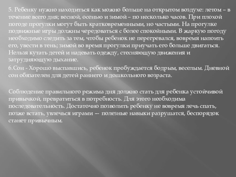 – в течение всего дня; весной, осенью и зимой – по несколько часов. При плохой погоде прогулки могут быть кратковременными, но частыми. На прогулке подвижные игры должны чередоваться с более спокойными. В жаркую погоду необходимо следить за тем, чтобы ребенок не перегревался, вовремя напоить его, увести в тень; зимой во время прогулки приучать его больше двигаться. Нельзя кутать детей и надевать одежду, стесняющую движения и затрудняющую дыхание.