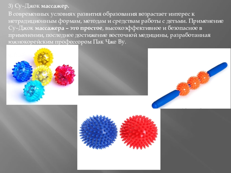 формам, методам и средствам работы с детьми. Применение Су–Джок массажера – это простое, высокоэффективное и безопасное в применении, последнее достижение восточной медицины, разработанная южнокорейским профессором Пак Чже Ву.