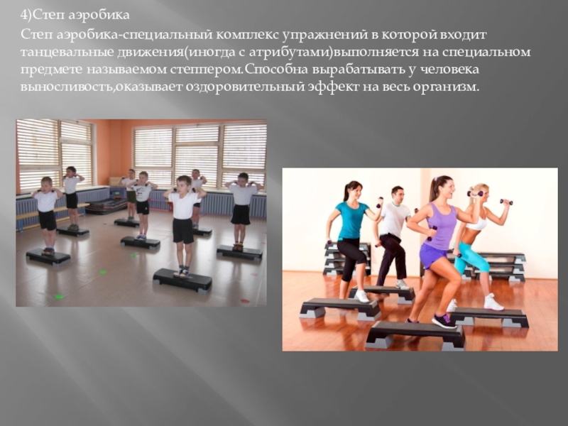 Степ аэробика-специальный комплекс упражнений в которой входит танцевальные движения(иногда с