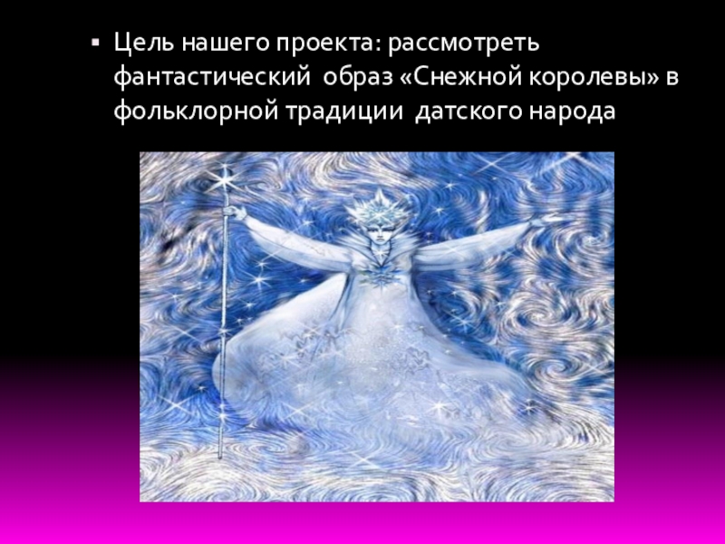 Цель нашего проекта: рассмотреть фантастический образ «Снежной королевы» в фольклорной традиции датского народа