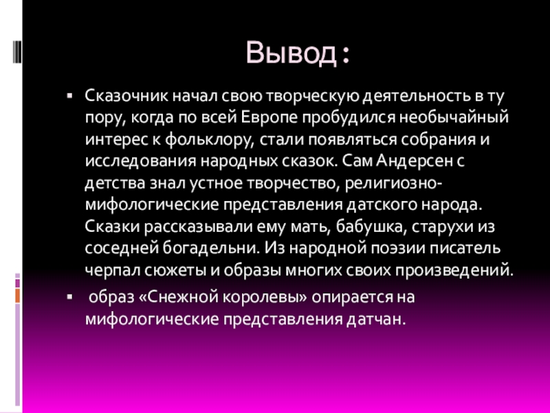 Вывод:Сказочник начал свою творческую деятельность в ту пору, когда по всей