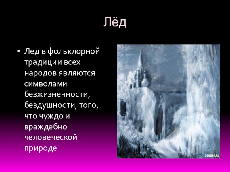 Лёд Лед в фольклорной традиции всех народов являются символами безжизненности, бездушности, того, что чуждо и враждебно человеческой