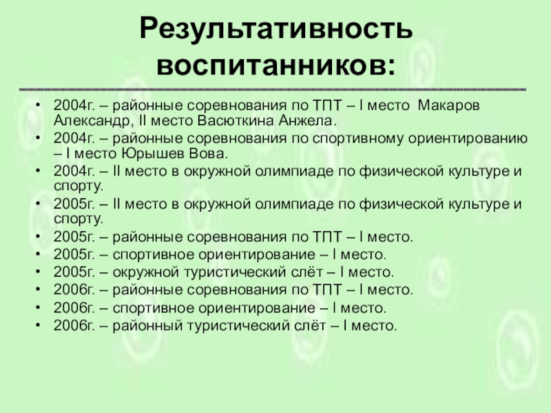 2004г. – II место в окружной олимпиаде по физической культуре и спорту.