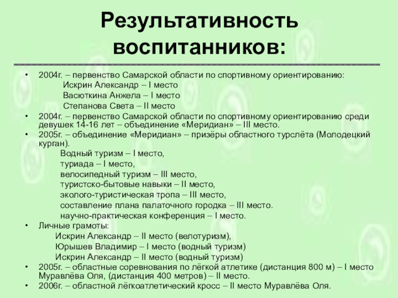 2004г. – первенство Самарской области по спортивному ориентированию среди девушек 14-16 лет – объединение «Меридиан» – III место.