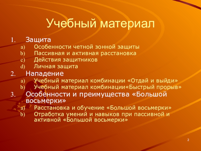 Учебный материалЗащитаОсобенности четной зонной защитыПассивная и активная расстановкаДействия защитниковЛичная защитаНападениеУчебный материал комбинации «Отдай и выйди»Учебный материал комбинации«Быстрый прорыв»Особенности и преимущества «Большой восьмерки»Расстановка и обучение «Большой восьмерки»Отработка умений и навыков при пассивной и активной «Большой восьмерки»
