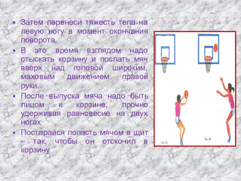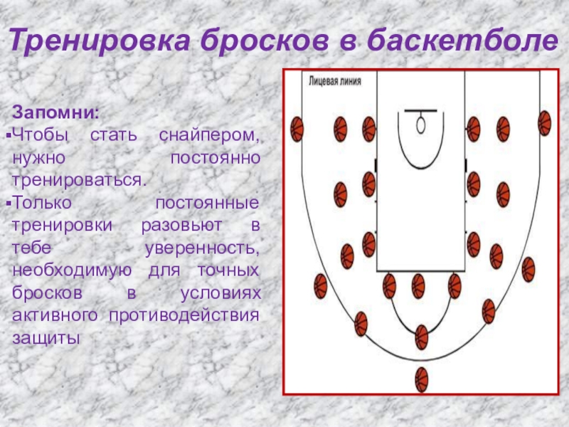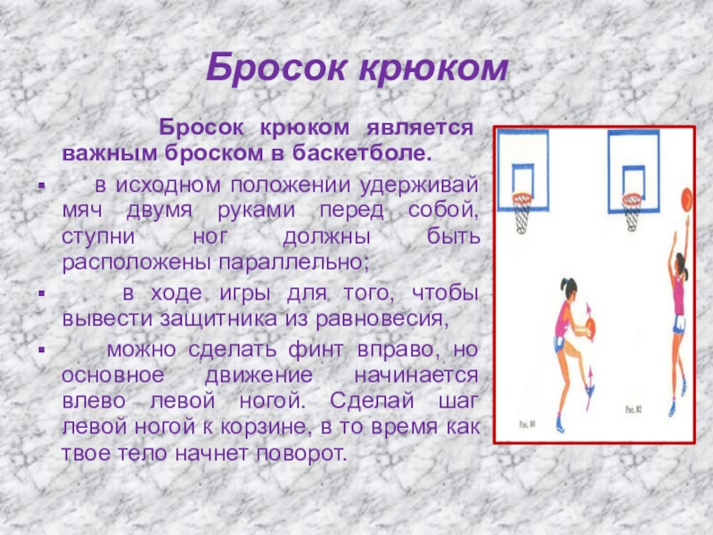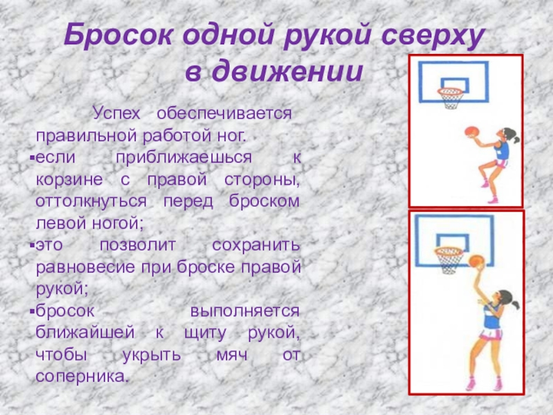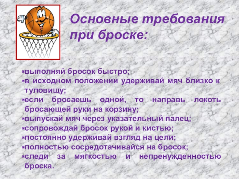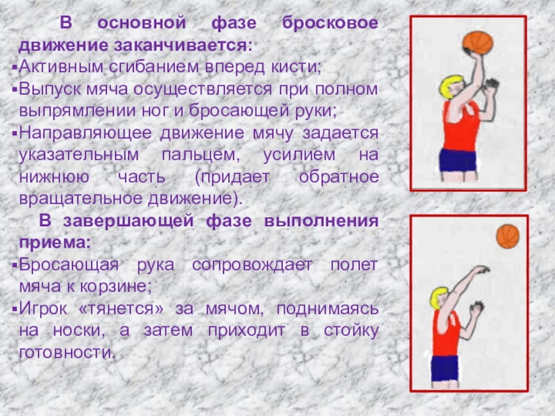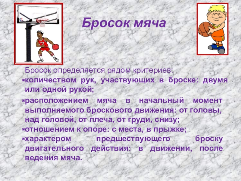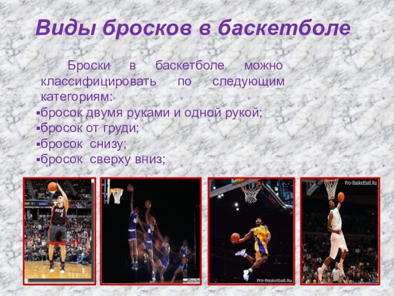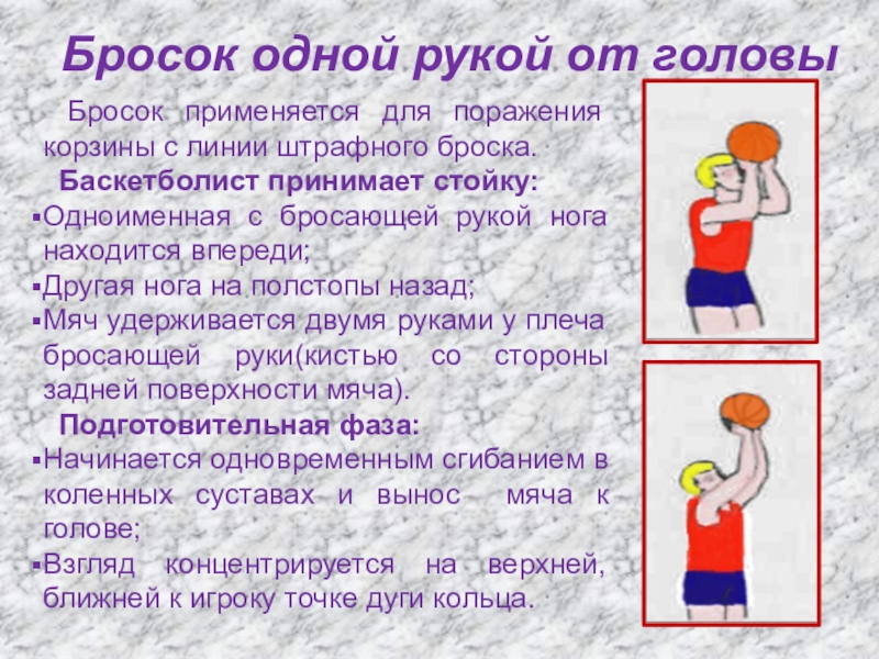 расположением мяча в начальный момент выполняемого броскового движения: от головы, над головой, от плеча, от груди, снизу;