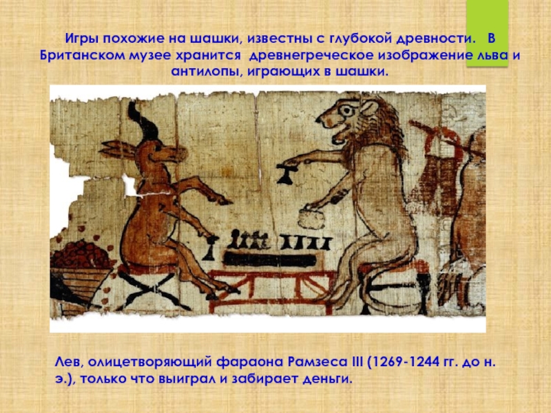 Лев, олицетворяющий фараона Рамзеса III (1269-1244 гг. до н.э.), только что выиграл и забирает деньги.