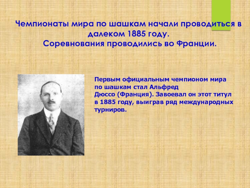 Первым официальным чемпионом мира по шашкам стал Альфред Дюссо (Франция). Завоевал он этот титул в 1885 году, выиграв ряд международных турниров.