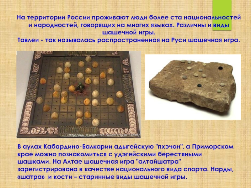 В аулах Кабардино-Балкарии адыгейскую "пхэчон", а Приморском крае можно познакомиться с удэгейскими берестяными шашками. На Алтае шашечная игра "алтайшатра" зарегистрирована в качестве национального вида спорта. Нарды, «шатра» и кости – старинные виды шашечной игры.