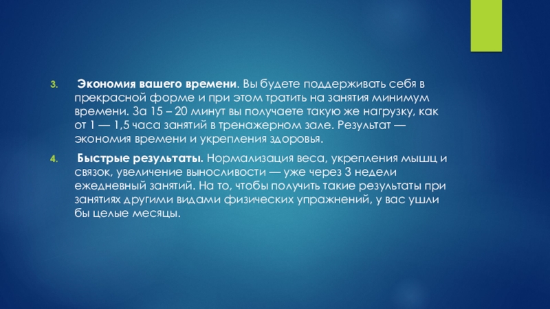 и при этом тратить на занятия минимум времени. За 15 – 20 минут вы получаете такую же нагрузку, как от 1 — 1,5 часа занятий в тренажерном зале. Результат — экономия времени и укрепления здоровья.