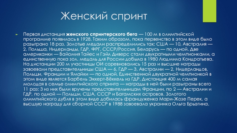 Бег на короткие дистанции раньше других видов легкой атлетики был признан доступным для женщин и включен в программу Олимпийских игр 1928 г.