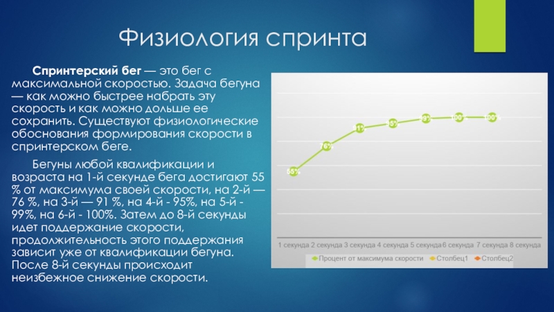 — как можно быстрее набрать эту скорость и как можно дольше ее сохранить. Существуют физиологические обоснования формирования скорости в спринтерском беге.