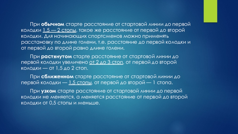 При сближенном старте расстояние от стартовой линии до первой колодки — 1,5 стопы, от первой до второй — 1 стопа.